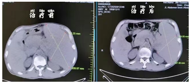 接下来的治疗日子里,赵先生严格遵照医嘱,按时接受化疗。化疗的过程并不轻松,但每次想到医生的鼓励和家人的陪伴,他都告诉自己要坚持下来,而病情的好转,也在一点点给予他信心:治疗半个月后,困扰已久的腹胀感明显减轻,一个疗程结束,乏力症状逐渐消失,他终于能自己下楼慢慢散步,最新的腹部 CT 显示,之前肿大的脾脏已明显缩小,血小板数量也回升到了接近正常的水平。