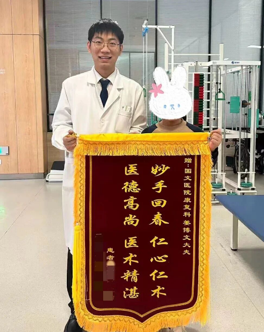 三个月的不懈坚持,让生命奇迹悄然绽放:小佳不仅成功脱离轮椅自主站立,还能稳稳地在病房内自由走动,甚至能尝试独立上下矮台阶。这份失而复得的行走能力,让父母满心欢喜、热泪盈眶。他们特意定制了锦旗,由小佳亲手送到治疗师手中。这面鲜红的锦旗,不仅是对国文康复医学科团队精湛技术的高度认可,更是对国文医院“不放弃每一个生命”医者仁心的最真挚致敬。