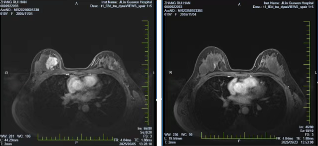 启动化疗4周期方案,联合戈舍瑞林治疗,病情达到部分缓解。为加快缩瘤进度,医院特邀天津医科大学肿瘤医院乳腺外科专家会诊,续行TE方案化疗2周期。复查结果令人振奋:右乳癌病灶从5.0×4.2×1.5cm缩小至3.2×2.6×0.9cm,右腋窝转移淋巴结完全消失,磁共振显示病灶大幅缩小,保乳手术条件已完全具备。